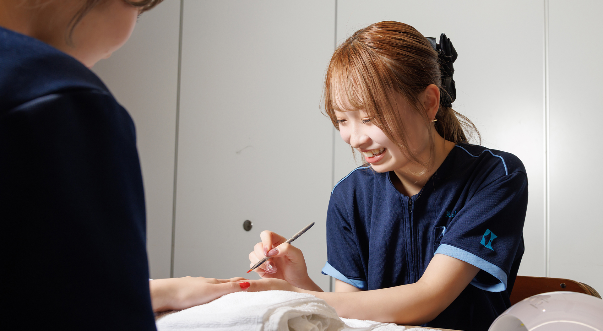 必修コースに加えて、ヘッドヒーリングコース、ネイルコース、着付けコース、エステティックコース、メイクアップコース、カットカラーコースの6種類からコース選択を行います。1・2年次でそれぞれ1コースずつ選択でき、希望によりもう1コース追加で学べるため、2年間で最大4コースを選択することも可能。様々な資格を取得することでより多くの専門知識を身につけることができます。