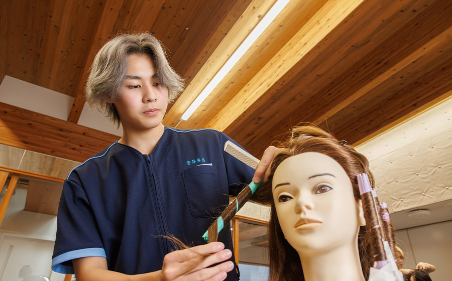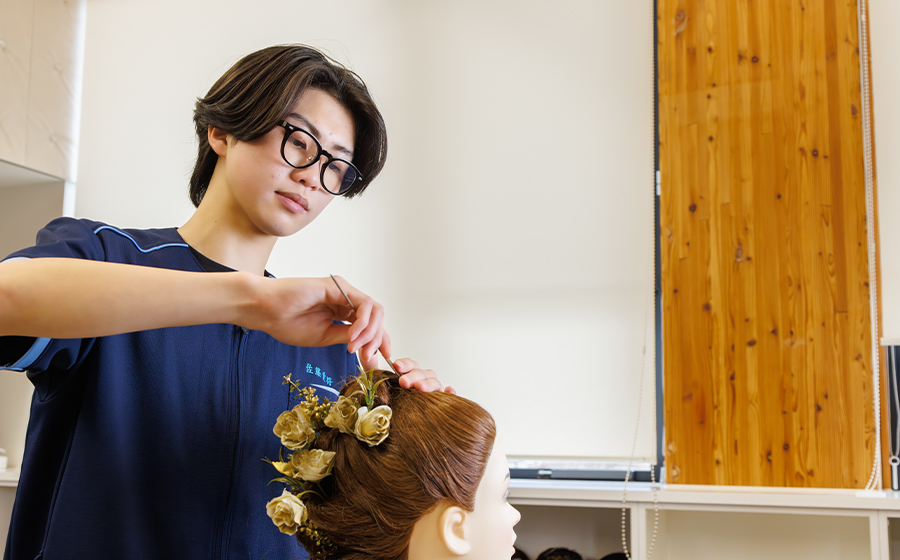 「とかす」「結う」などのテクニックを学び、長さのある毛髪をまとめあげます。アイロンやホットカーラーも使い、自分のイメージをカタチにします。
