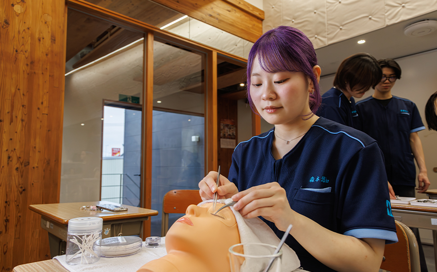 もともと生えているまつ毛1本1本に人工毛(エクステンション)を装着する技術を学びます。同時に、目元の施術であるため、安全・安心を第一として技術者の心構えや配慮も身に付けます。