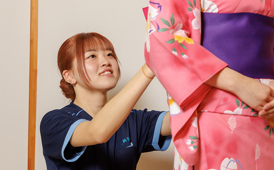 七五三や成人式など、人生の大切なシーンに欠かせない着付け。着物や帯などの模様や色彩の調和を考えた総合的な美しさをより引き立てるための技術です。1年次では1人で着付けたり、相手に着せたりします。